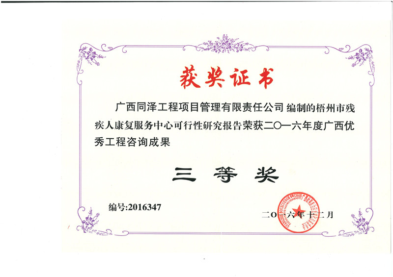 梧州市殘疾人康復服務中心可行性研究報告榮獲2016年度廣西優(yōu)秀工程咨詢成果三等獎