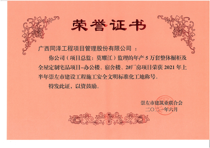 年產(chǎn)5萬套整體櫥柜及全屋定制宅品二期項目榮獲2021年崇左市安全文明工地