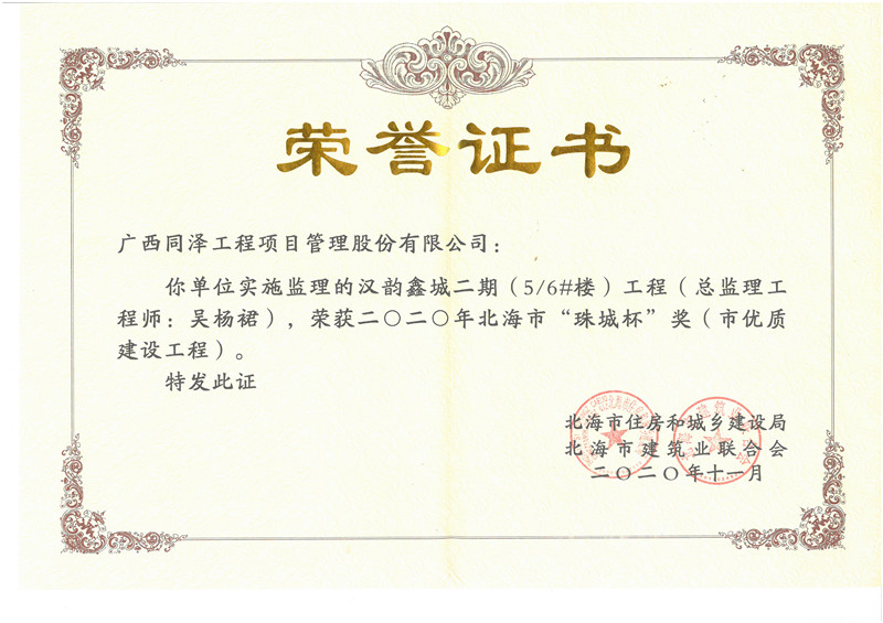 漢韻鑫城5#、6#樓榮獲2020年北海市“珠城杯獎”(市優(yōu)質(zhì)建設工程)