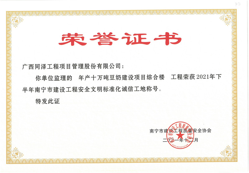 年產(chǎn)十萬噸豆奶建設項目綜合樓項目榮獲2021年下半年南寧市建設工程安全文明標準化誠信工地稱號