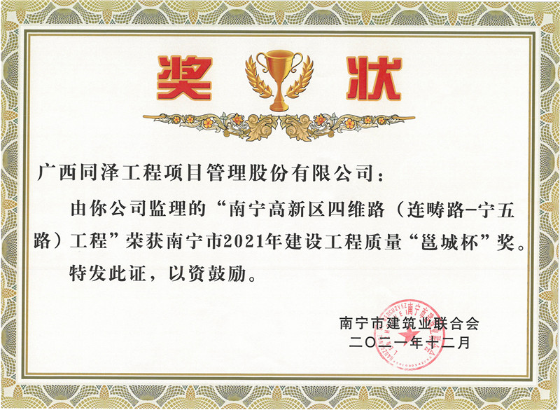 南寧高新區(qū)四維路(連疇路-寧五路)工程榮獲南寧市2021年建設工程質(zhì)量“邕城杯”獎