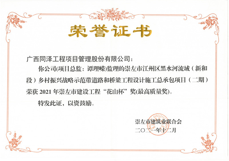 崇左市江州區(qū)黑水河流域(新和段)鄉(xiāng)村振興戰(zhàn)略示范帶道路和橋梁工程設計施工總承包項目(二期)項目榮獲2021年崇左市建設工程“花山杯”獎(最高質(zhì)量獎)
